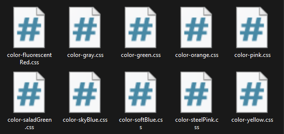 androidGreen.css- Android Green ColorfluorescentRed.css- Fluorescent Red Colorgreen.css- Green ColorlavenderRose.css- Lavender Rose ColormayaBlue.css- Maya Blue Colororange.css- Orange CoorsoftBlue.css- Soft Blue ColorsteelPink.css- Steel Pink Colorsunflower.css- Sunflower ColorlightGray.css- Light Gray Color